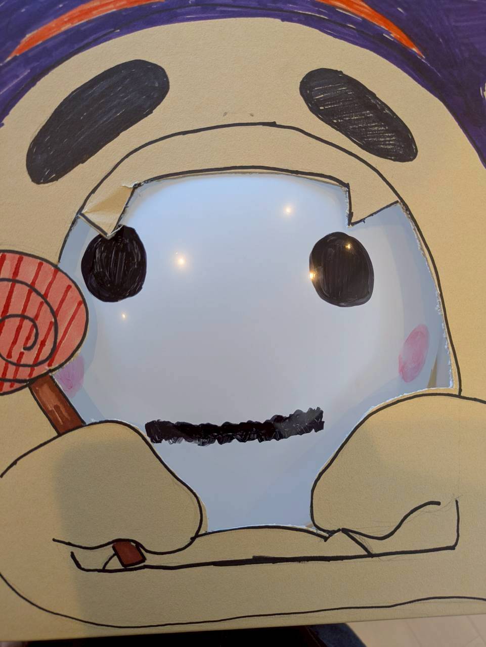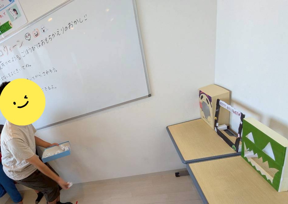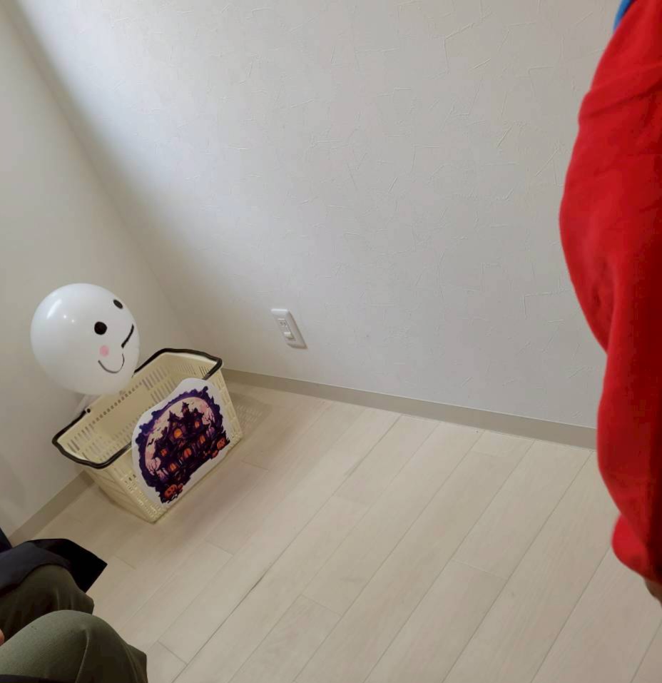 おばけの顔を描いた風船を、床の線の位置から投げて“おうち”のカゴに帰してあげるゲーム🎃
