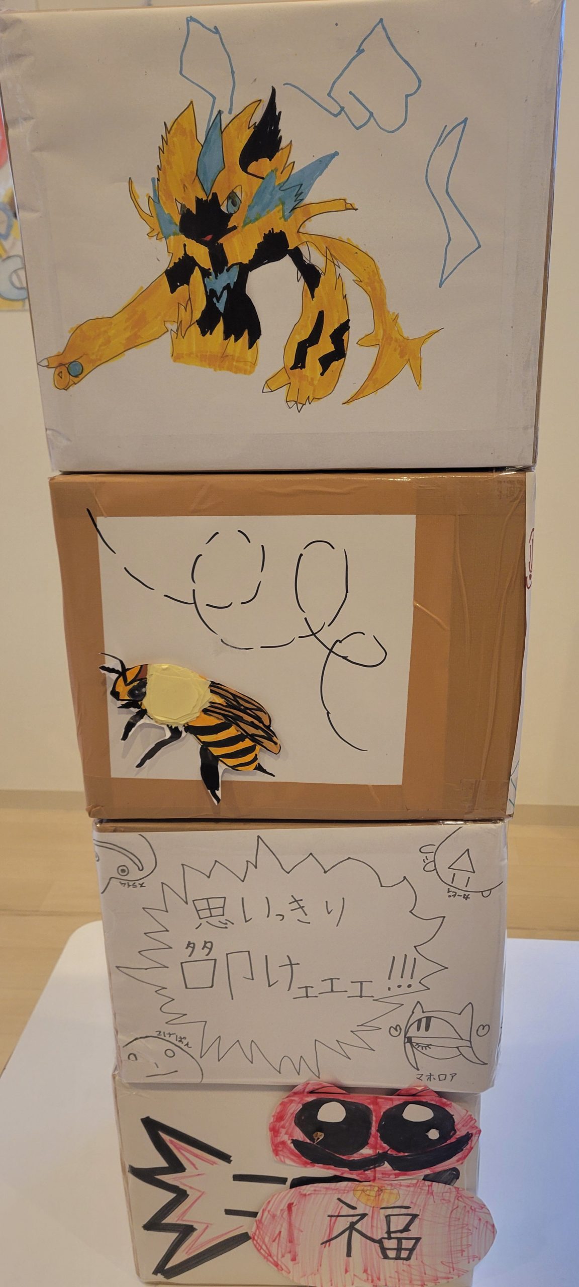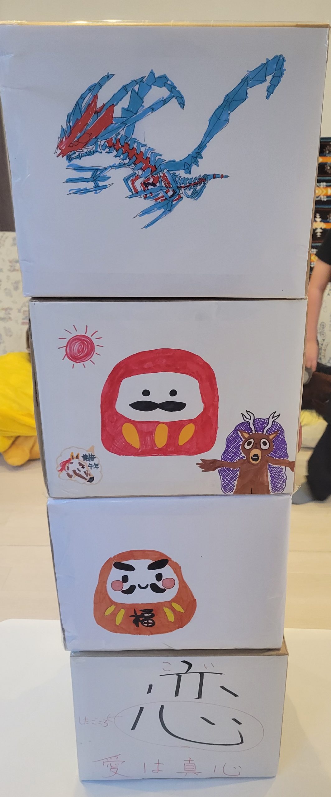 完成した絵を使って、ダンボールで作った大きなだるま落としを制作!