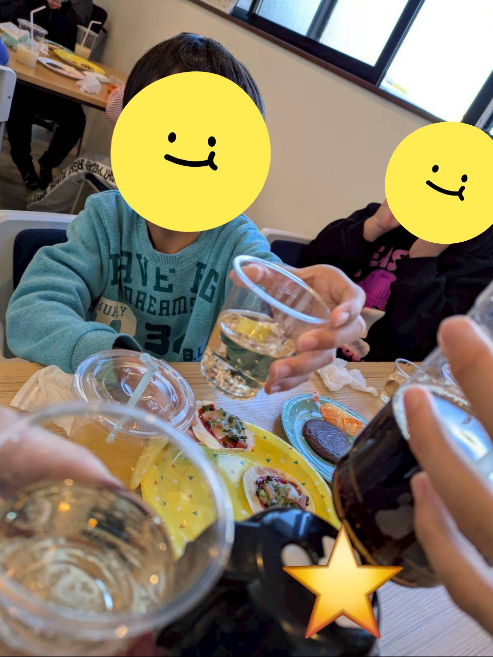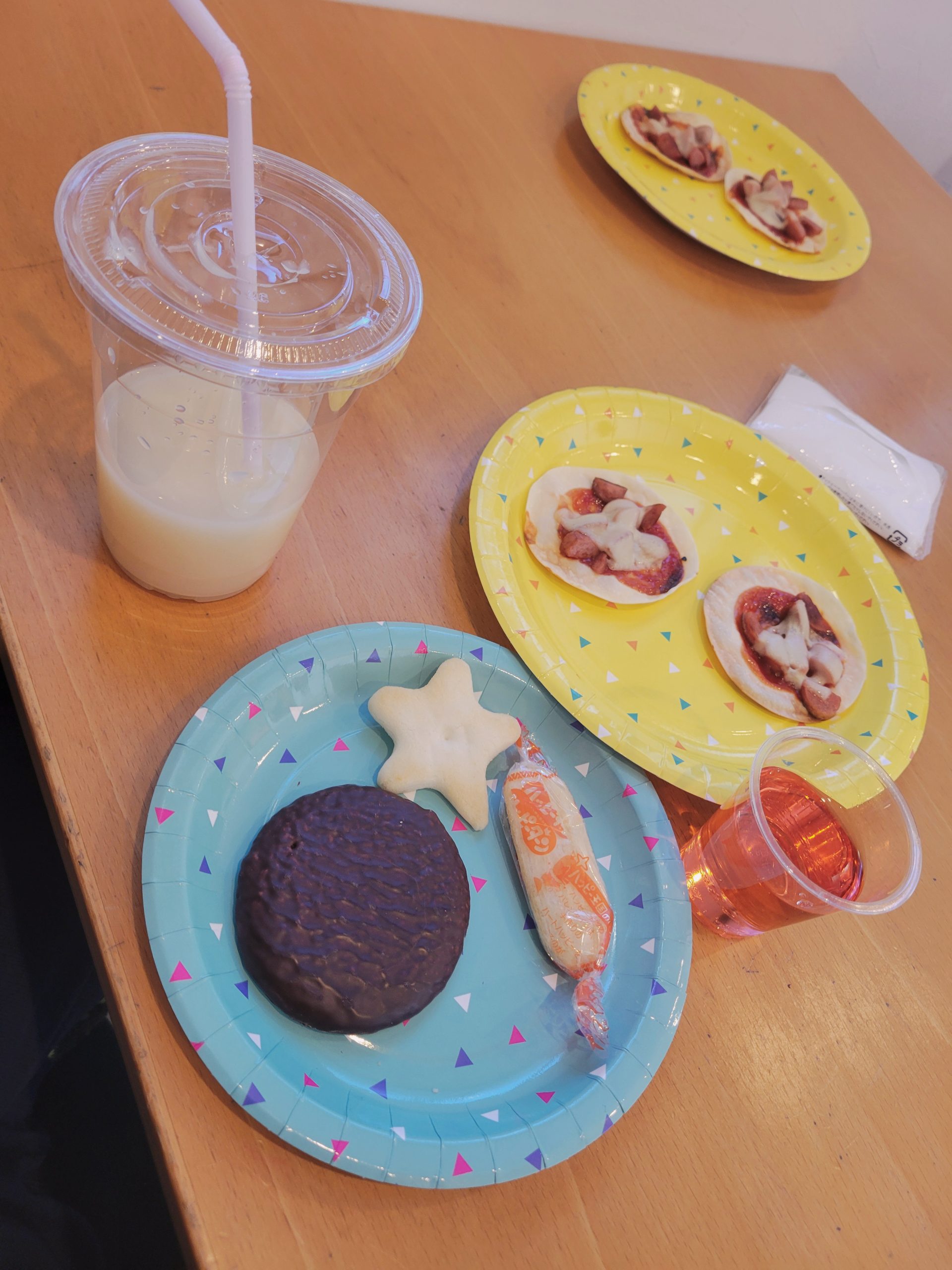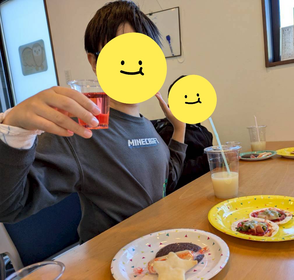 お友だちやスタッフと楽しくお喋りをしながら、美味しい餃子の皮ピザやお菓子、ジュースをあっという間にぺろり😋🍴