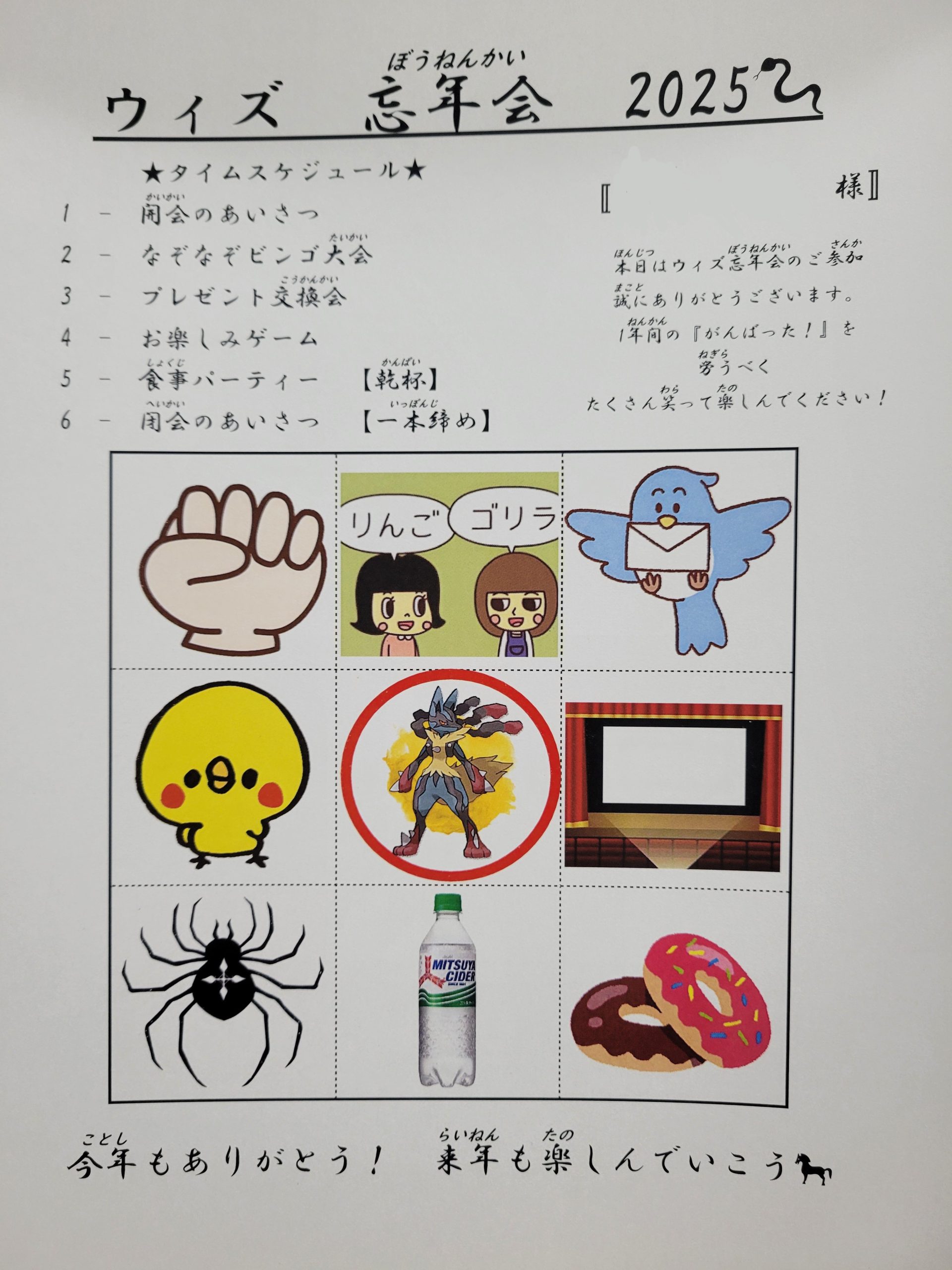 忘年会では、まず1人1枚、忘年会のタイムスケジュールが書かれたビンゴカードを配られた後に開会のあいさつがありました👏