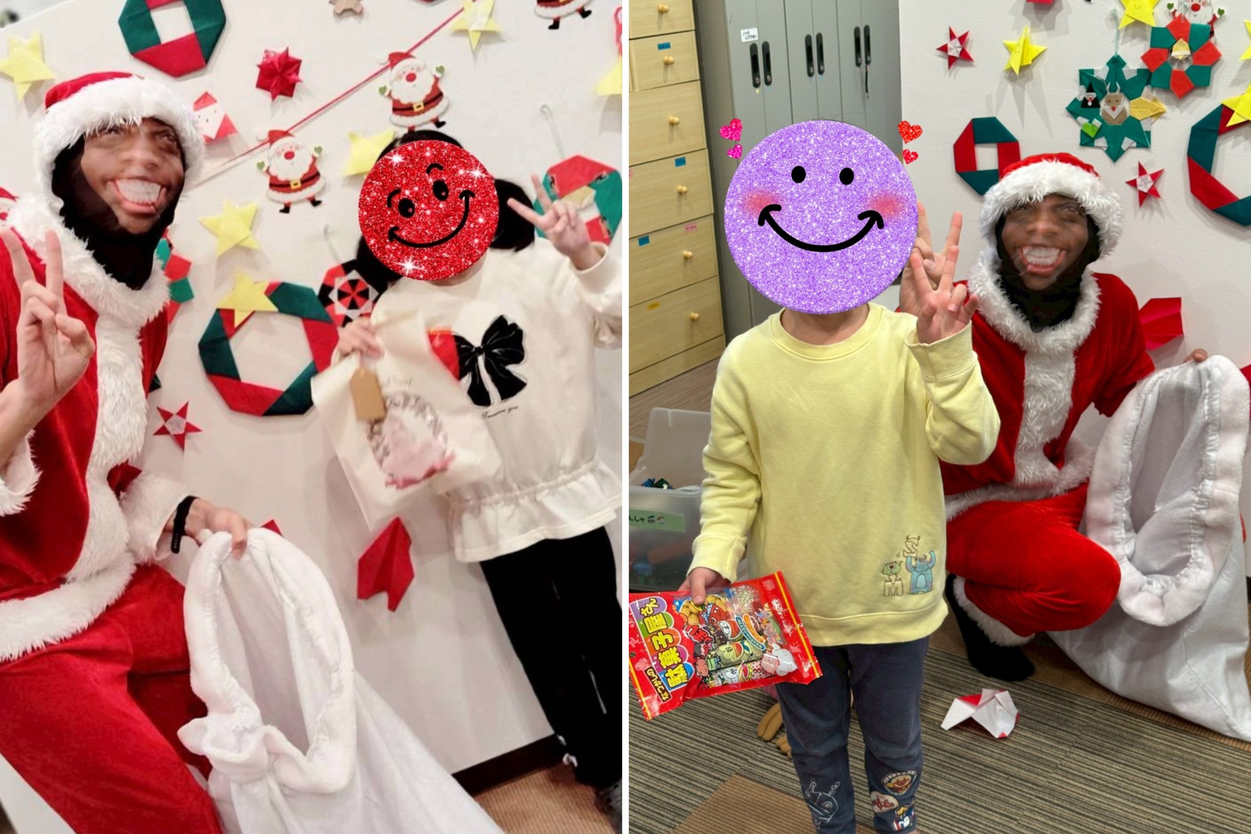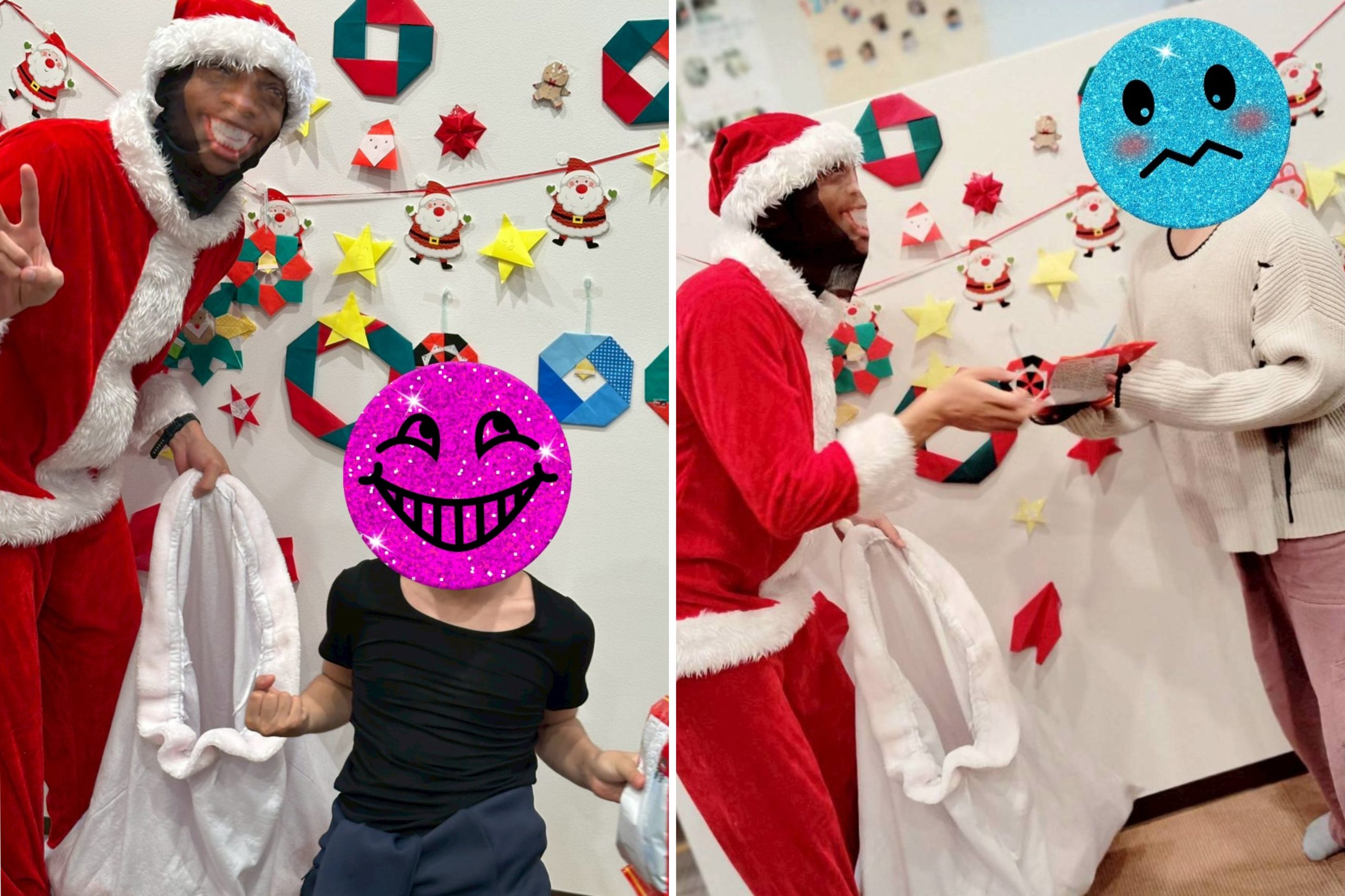 サンタさんの登場に驚きながらも、プレゼントを受け取り記念のツーショット📸